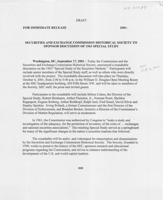 The Society also plans its first recorded program, to be held on October 4, 2001, that will feature key players from the 1963 Special Study of the Securities Markets, arguably one of the most important studies of the markets ever completed by the SEC.