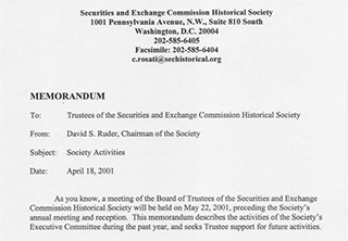 In a memo to his fellow Trustees on April 18, 2001, Society Chairman David Ruder describes the Society’s accomplishments and future activities, including sponsorship of a major issues conference to explore challenges facing the Commission in the next decade. [9066]