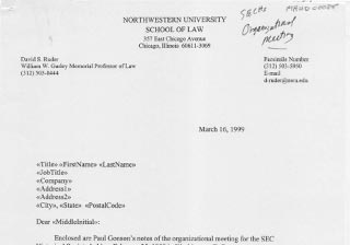 On March 16, 1999, David Ruder drafts a letter to the participants of the February 25 organizational meeting outlining a schedule of steps for creating the SEC Historical Society.