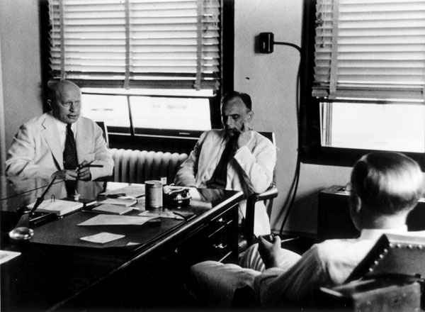 (standing) Joseph R. Swan, Guaranty Company of New York; Daniel W. Myers, Hayden, Miller & Co., Cleveland; George Whitney, J.P. Morgan & Co., New York; Henry B. Tompkins, Robinson-Humphrey Co., Atlanta; Frank Weeden, Weeden & Co., San Francisco; Frank McNair, The N.W. Harris Company, Chicago; Lamartine V. Lamar, Lamar, Kingston & Labouisse, New Orleans; Edward H. Hilliard, J.J.B. Hilliard & Son, Louisville; Sidney J. Weinberg, Goldman, Sachs & Co., New York; George W. Bovenizer, Kuhn, Loeb & Co., New York; Arthur H. Bosworth, Bosworth, Chanute, Loughridge & Company, Denver; W. Hubert Kennedy, Wells-Dickey Co., Minneapolis; Charles A. Mead (Secretary); Harry S. Grande, Grande, Stolle & Co., Seattle; Lawrence Marks, Lawrence H. Marks, New York; and Orrin G. Wood, Estabrook & Co., Boston; (seated) Frank L. Scheffey (Deputy Managing Director); Rollin A. Wilbur (Managing Director); Paul V. Keyser (Counsel); Francis A. Bonner, Bonner, Troxell & Co., Chicago (Vice Chairman); B. Howell Griswold, Jr., Alex. Brown & Sons, Baltimore (Chairman); Corcoran Thom, American Security & Trust Co., Washington (non-voting committee member); Myron T. Ratcliffe, Assistant Deputy Administrator for Financial Codes, N.R.A., Washington; Karl J. Ammerman, Deputy Administrator for Financial Codes, N.R.A., Washington; and Sydney P. Clark, E.W. Clark & Co., Philadelphia (Treasurer). Code Committee members not in picture: Edward J. Costigan, Whitaker & Co., St. Louis; Ralph T. Crane, Brown Harriman & Co., Inc., New York; and Robert H. Moulton, R.H. Moulton & Co., Los Angeles.